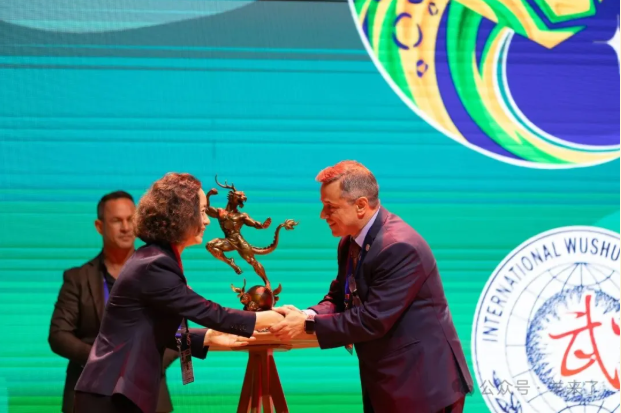 随后,国际武联秘书长张玉萍向组委会赠送赛事纪念雕塑,这不仅承载着对赛事的美好期许,更是对武术在拉美地区蓬勃发展的献礼。