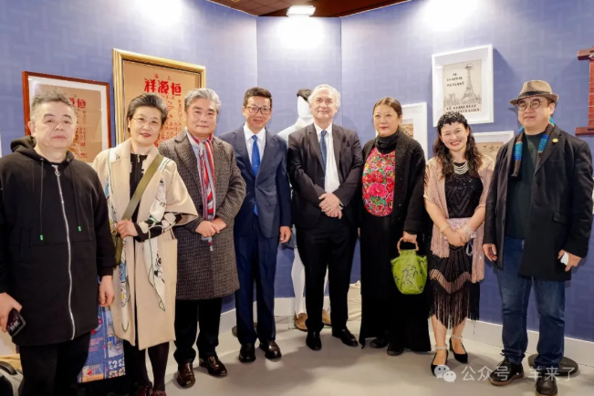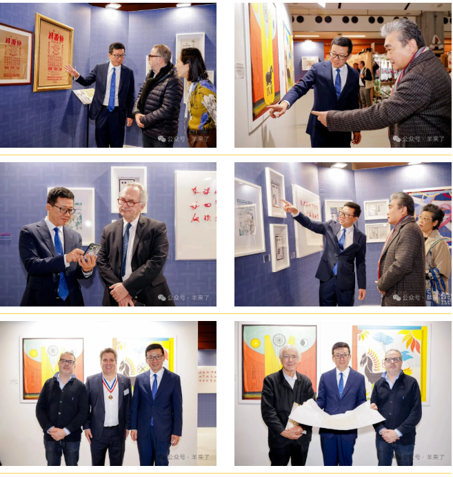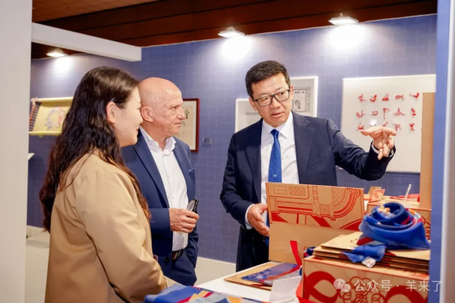 10月24日,法国艺术工会及巴黎国际文化遗产沙龙主席斯蒂芬·加勒诺(Stéphane Galerneau)、中国驻法国大使馆公使陈力夫妇、文化参赞王茵等嘉宾莅临恒源祥展区,恒源祥集团董事长兼总经理陈忠伟等热情接待并详细介绍恒源祥的发展历程。