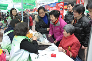 2012年10月22日 重阳节前夕,集团青年党员、青年志愿者们为宝兴社区的“纳保”老人编织爱心围巾,送上节日祝福。